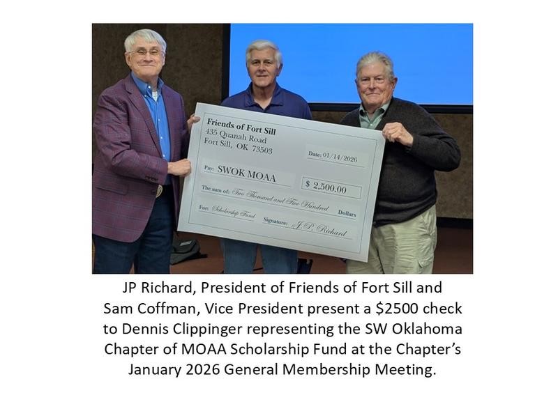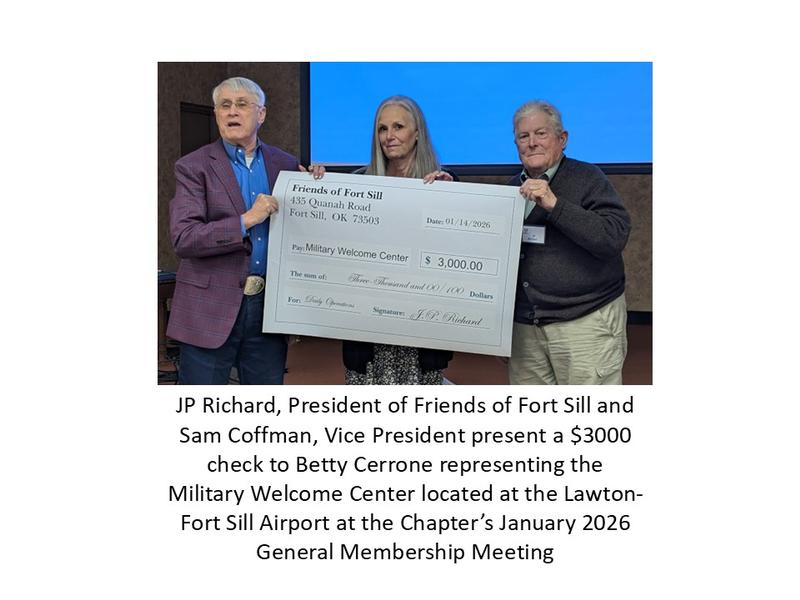 Friends of Fort Sill (FoFS) presented checks to the "Military Welcome Center" and the Chapter's Scholarship Fund.  FoFS is a non-profit organization providing manpower, advocacy and financial assistance to Fort Sill and the SWOK area in military related matters.